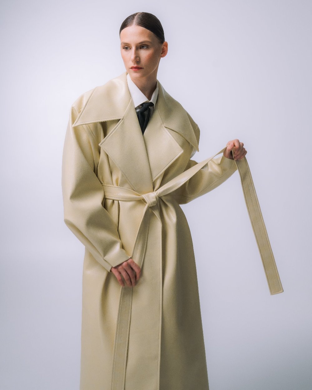 ПАЛЬТО З ГРАФІЧНИМ КОМІРОМ З ЕКО-ШКІРИ МОЛОЧНЕ